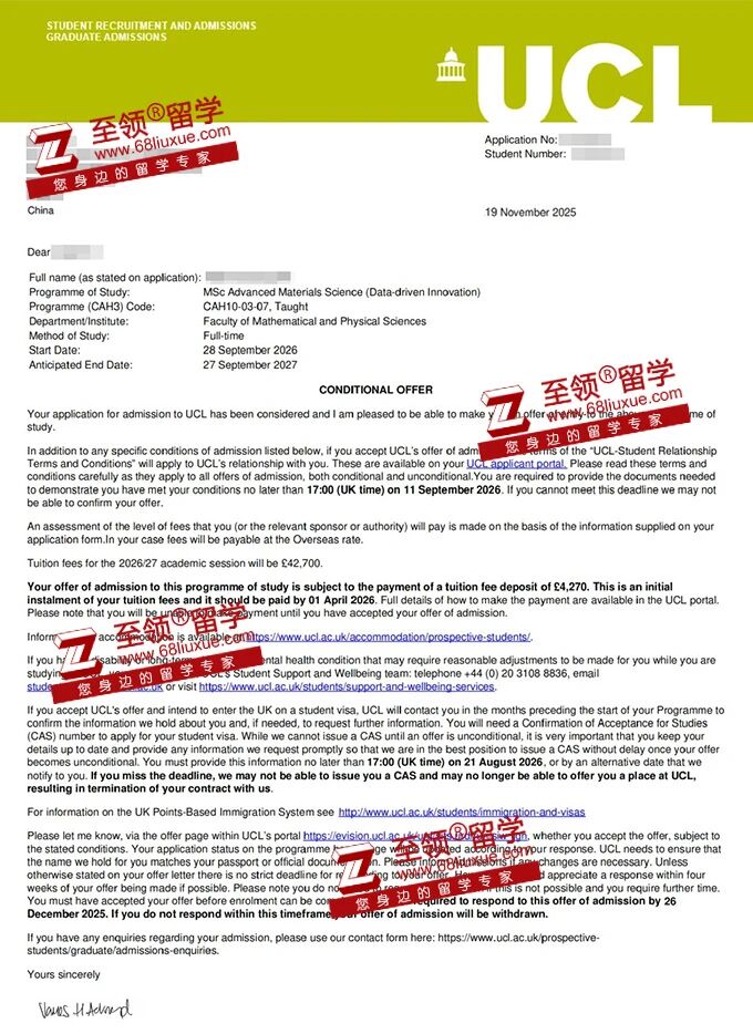 录取结果:伦敦大学学院,高级材料科学硕士录取