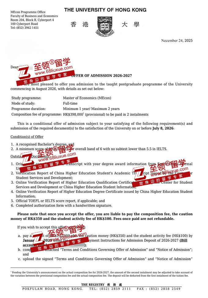 学生在大三时曾赴港中文作为交换生学习,这段经历不仅让她积累了国际化学习经验,还获得了交换期间授课教授的推荐信。O同学有一段在券商的实习,这也是重要加分项。文书材料中紧紧抓住这两段经历,突出学生如何将课堂理论应用于实际工作,与港大偏重实践与学术结合的特点相契合。申请时间上,瞄准了首轮窗口提交材料,提交两个星期左右收到了香港大学发来的OFFER。