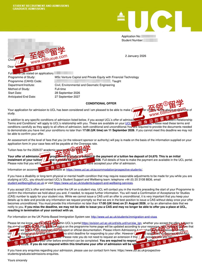 录取结果:伦敦大学学院风投私募与金融科技硕士录取